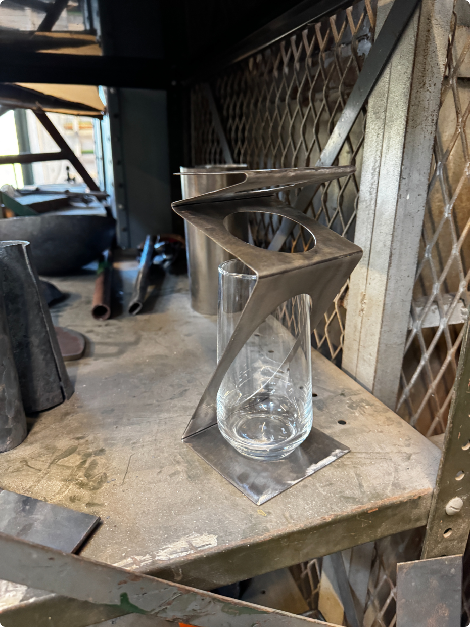Bloom is a sheet metal vase frame that transforms a simple glass cylinder into a composed flower display. A single bent metal sheet supports the glass and guides the stem through a cutout, controlling the flower’s posture with minimal material. By using structure and negative space instead of decoration, Bloom turns an everyday vessel into a clean sculptural object that feels light, stable, and intentional.